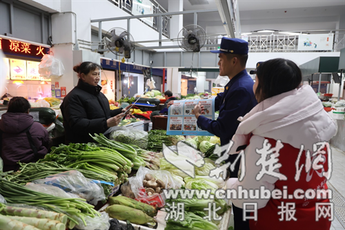 消防人员和社区工作人员前往农贸市场开展消防宣传、发放海报。通讯员 魏欢欢 摄