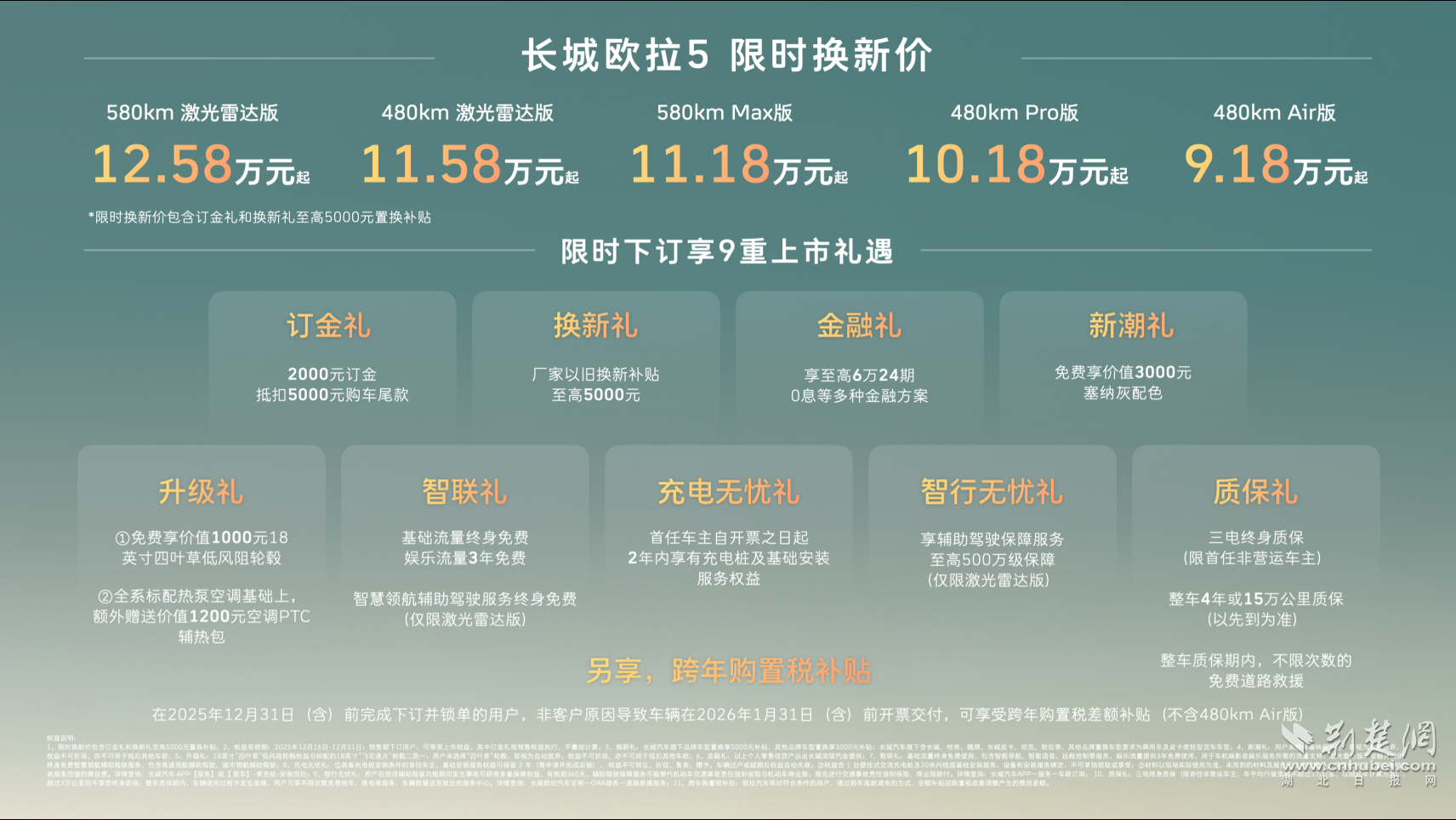 12月16日,长城汽车欧拉品牌全新A级纯电动SUV——长城欧拉5正式上市。新车共推出5款配置,建议零售价为9.98万元-13.38万元。限时置换价91800元起(限时置换价包含“充值赠品”和“置换赠品”以及最高5000元的以旧换新补贴)。为回馈广大用户的厚爱与支持,即日起至2025年12月31日,下单锁单的用户即可无忧享受存款礼、兑换礼、智能出行礼等9项首发礼,以及跨年购置税补贴(不含480公里空中版权益)等优厚购车权益。凭借公平的价格权益和强大的产品力,长城欧拉5致力于成为全球年轻用户的“首选伙伴”。
